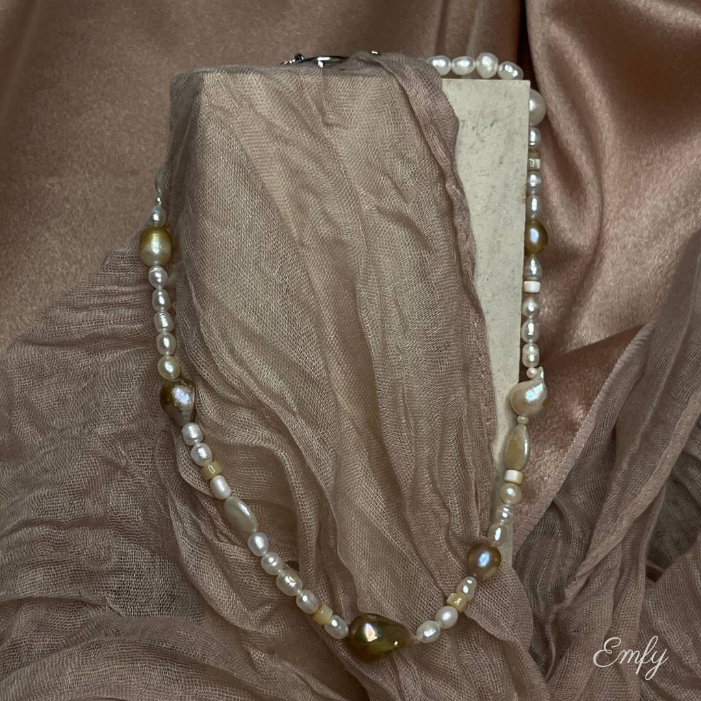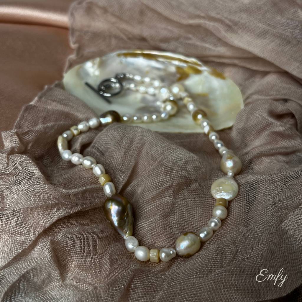 Édesvízi tenyésztett gyöngyök és természetes ásványok harmonikus találkozásából készült nyaklánc. Letisztult, elegáns, amely időtlen kifinomultságot ad.